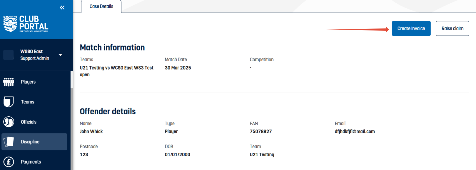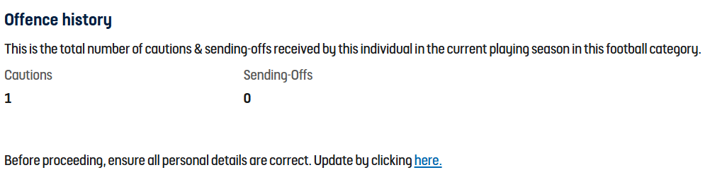 Warning - you will only be able to acknowledge and raise the invoice for the the card if the players details are on their FAN, i.e. Name, DOB, postcode. If any details are missing, scroll to the offence history within the case ID where there is a link to update details.