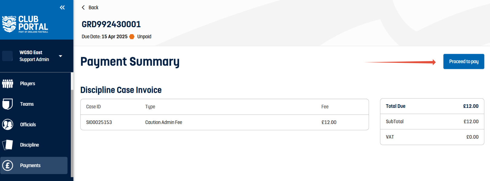 Once you have created you will then be directed to the payments tab where the invoice will be waiting to be paid. Select the proceed to pay option to select your payment method.