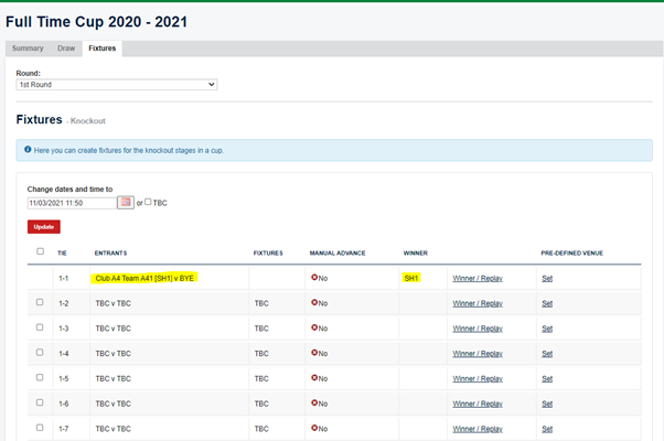 After you have completed the draw and clicked update at the bottom of the page, the fixtures tab will then show the fixtures for that round, if there is already a winner (if a fixture has a bye) and you can also set the venues for each fixture.