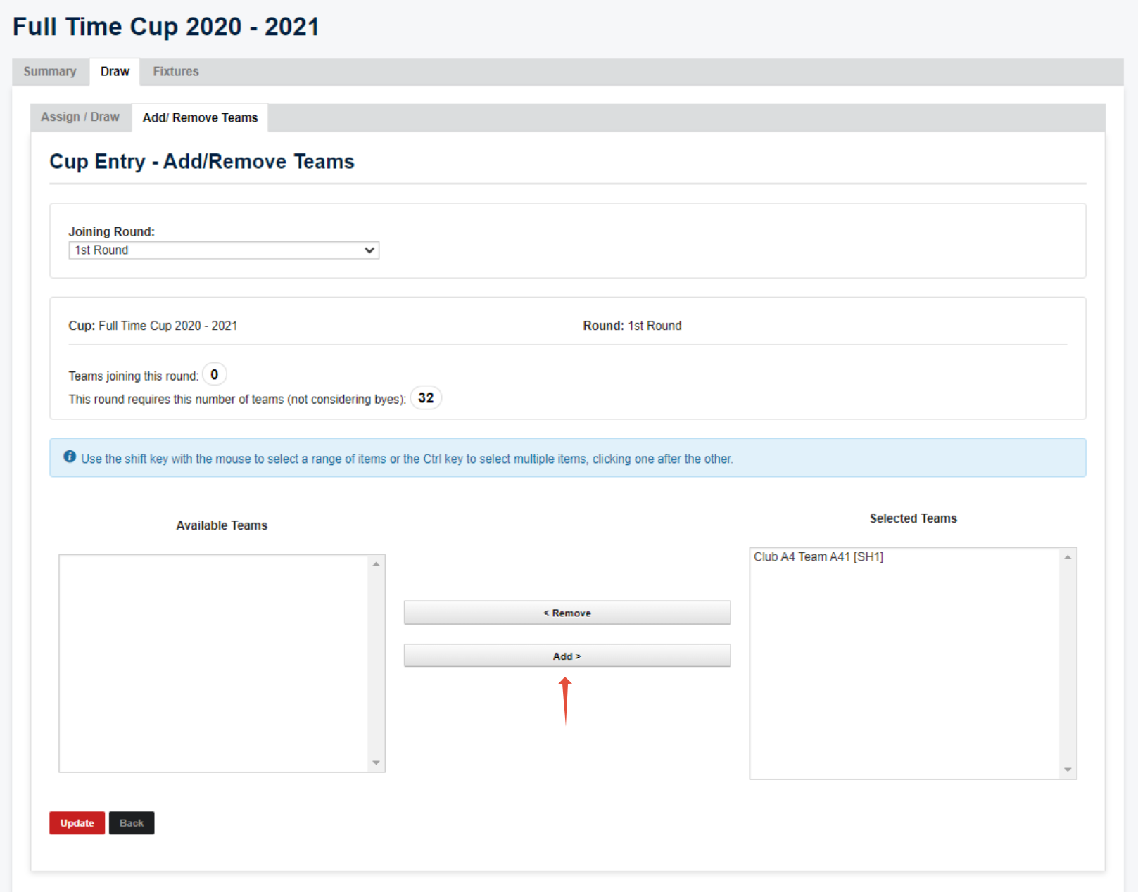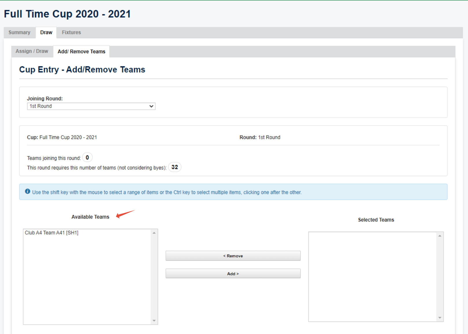After all the Teams have been added to the Cup (click here to see how to do this) you will then be able to complete the Cup draw. Select the Cup in Full Time and then select the “Draw” tab and then the “Add / Remove Teams”. The Teams you added via the Teams tab in Whole Game will appear in the “Available Teams” box on the left.