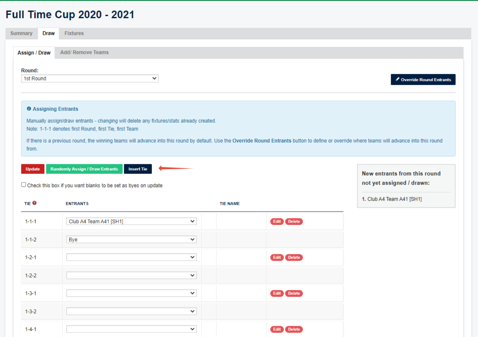 This now means the Teams have been moved across into the draw. Click on the Assign / Draw tab and you will then be able to either manually select the Teams and assign the draw / fixtures (or if a Team gets a bye in that round) or you can use the “Randomly Assign / Draw Entrants” option in green.